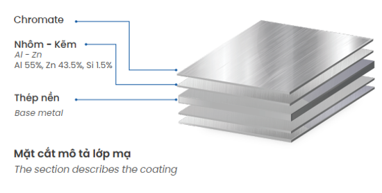 Thép mạ lạnh: Tôn lạnh là thép dạng cuộn được phủ 2 lớp bề mặt bằng hợp kim (55% Nhôm, 43.5% Kẽm, 1.5% Silic), với khả năng chống ăn mòn vượt trội, lớp mạ có độ dẻo và độ bám dính tốt, đảm bảo khả năng định hình tuyệt vời cho các ứng dụng khác nhau